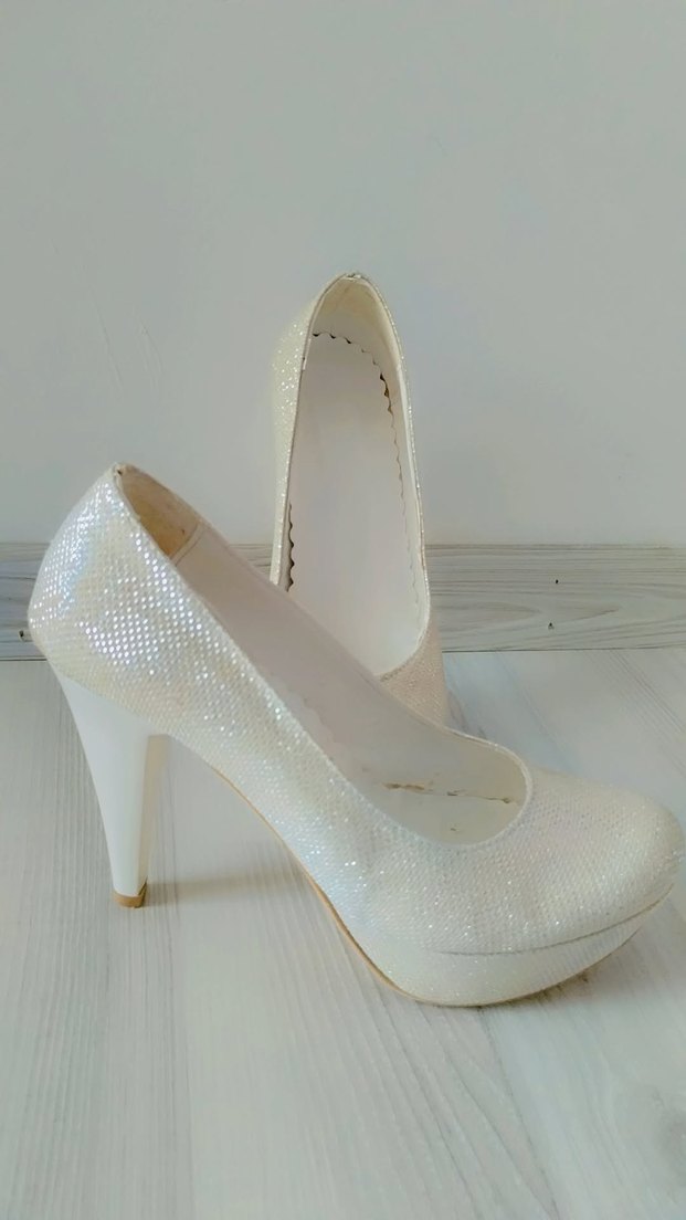 Yüksek topuklu, beyaz parlak yılan desenli ve sim detaylı kadın ayakkabısı. Kauçuk görünümlü malzemeden, düğün ve özel anlar için modern klasik tarzda. ✨