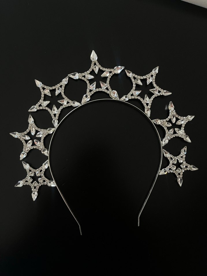Bu metal taç, beyaz parlak yıldız desenleriyle trend ve avangart bir görünüm sunar. Eşsiz tasarımıyla gotik bir hava katar. ✨ Sadece kına gecemde kullandım. Hiçbir yerinde bir kusur yoktur. Sapasağlamdır.