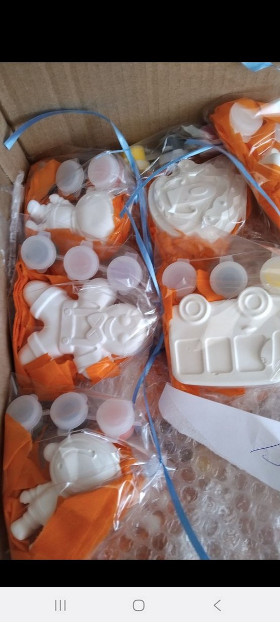 Beyaz renkli çeşitli şekillerde parti süsleri, turuncu kağıt ve mavi kurdele ile paketlenmiş.