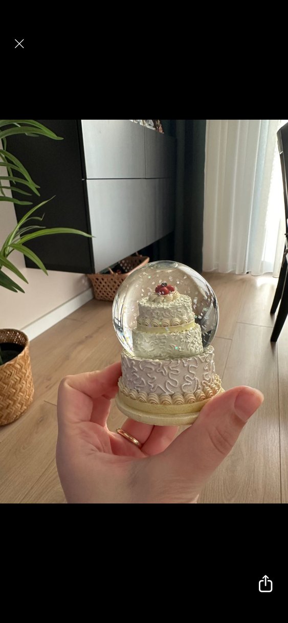 Beyaz figür, içinde pasta tasarımı olan şeffaf kar küresi içerir. Detaylı krem desenleri ve üstte kiraz bulunur. Dekoratif olarak kullanılabilir. ❄️