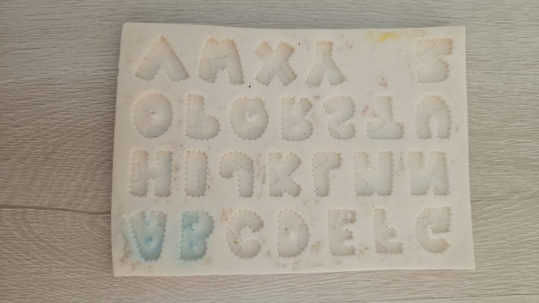 Yumuşak dokulu beyaz puzzle, pastel renkli alfabe parçalarından oluşur. B, C, D, E gibi harfler içerir. slikon kalıp sorunsuz