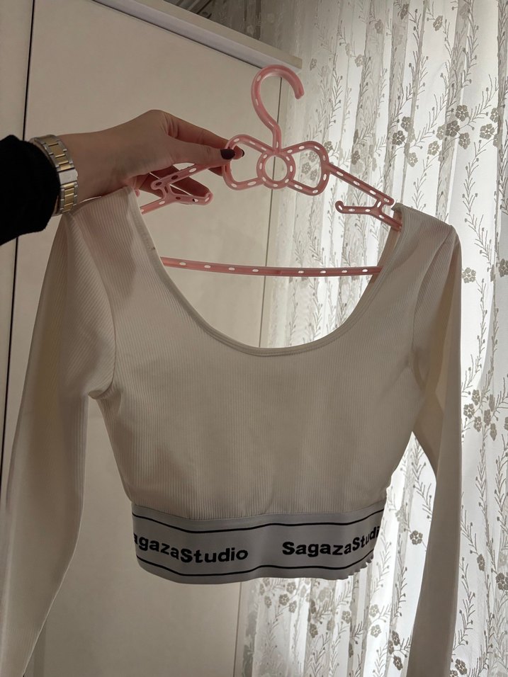 Hafif kıyafetler için uygun beyaz pastel renkli, dekoratif fiyonk detaylı askı. Üzerinde 'SagazaSt' yazısı bulunur. Sadece son fotoğraftaki yerinde ruj lekesi var onu da denerken oldu giymediğim için uğraşmadım.