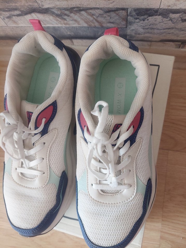 Beyaz renkli, pastel baskılı detaylara sahip, dolgu topuklu ve bağcıklı tasarımlı, kauçuk tabanlı spor ayakkabı.