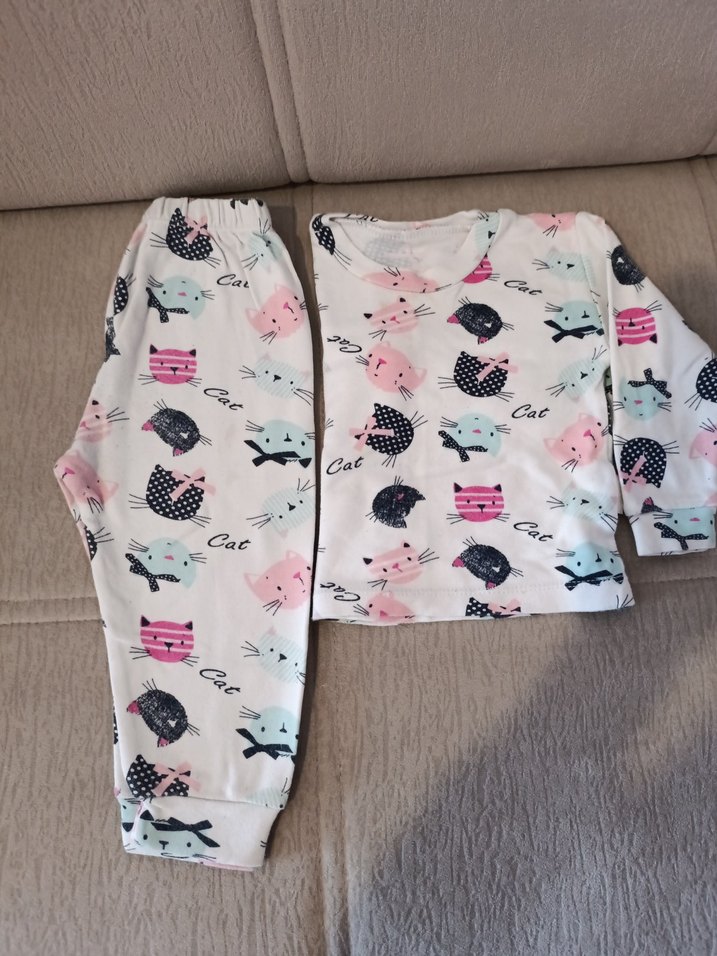 Beyaz zemin üzerine pastel renkte baskılı kedi yüzleri bulunan, örgü dokulu, sokak stili evcil kedi kıyafeti.