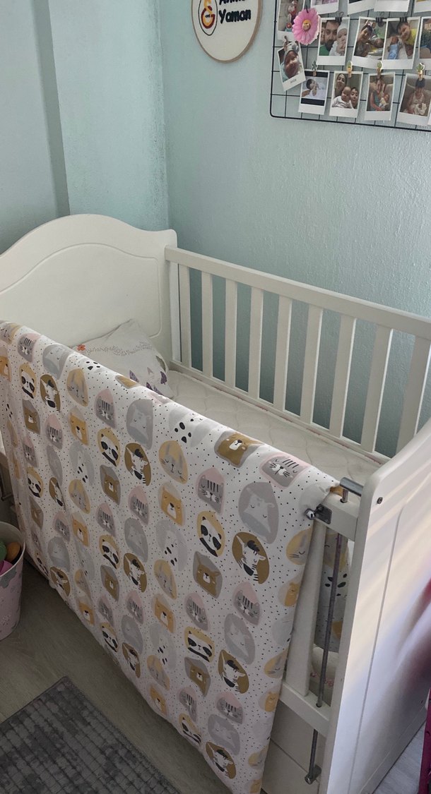 Beyaz bebek beşiği, sevimli hayvan desenli pastel tonlarda koruyucu örtü ile birlikte. Çubuklu yanları ve sade, klasik tasarımı vardır.çok temiz kullanıldı ve çok kısa süreli kullanıldı hiç bir sıkıntısı yok İzmir’den elden teslim alınabilir.yatağıyla bir verilecektir