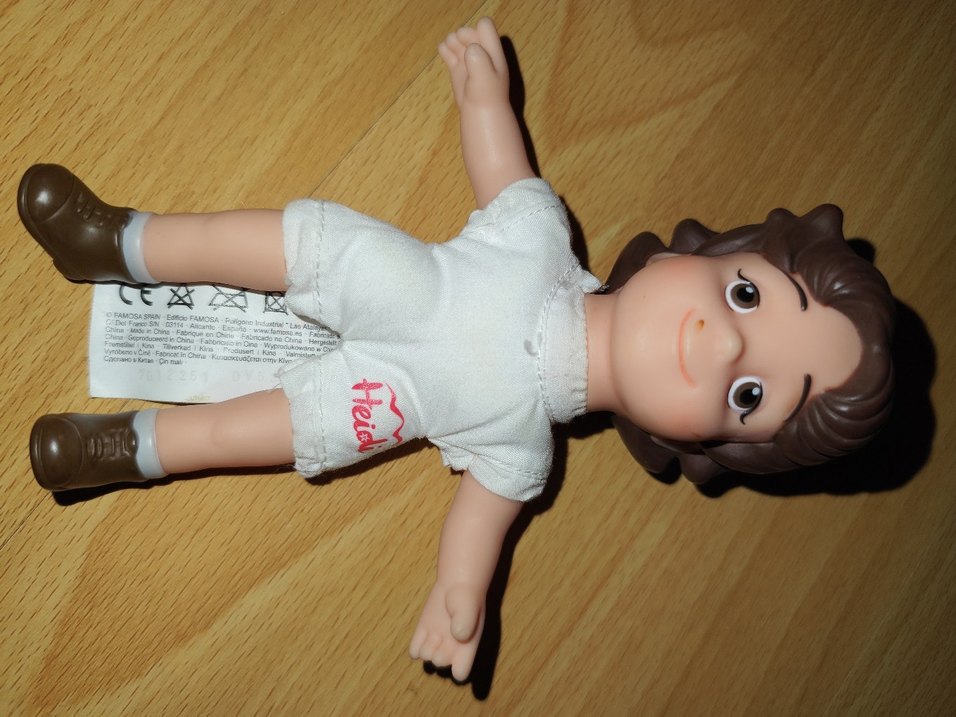 Bu beyaz pastel bebek, yumuşak plastik uzuvlara sahiptir ve üzerinde kırmızı logolu sade beyaz bir kıyafet giymektedir. Oyun ve koleksiyon için uygundur.