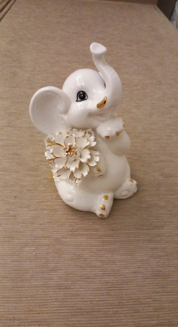 Altın detaylı beyaz pastel büyük fil biblo, yan tarafında detaylı bir çiçek bulunur. Parlak ve pürüzsüz yüzeye sahiptir.