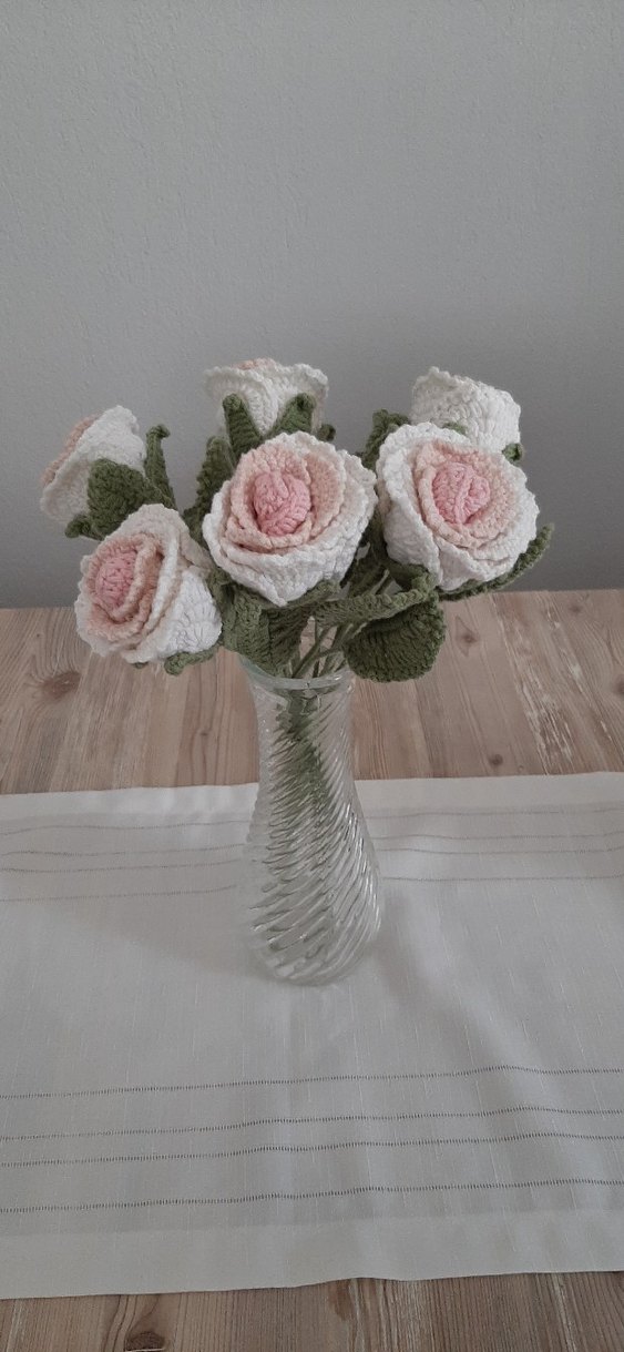 Şeffaf cam vazo, pastel beyaz ve pembe tığ işi çiçekler ile yeşil yaprakları barındırır.