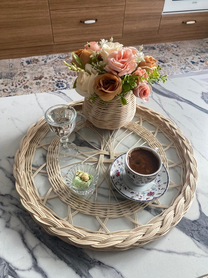 Beyaz renkte, pastel çiçek desenli ve örme tasarımlı bohem tarzı tepsi, içecek servisinde veya dekorasyonda kullanılabilir.