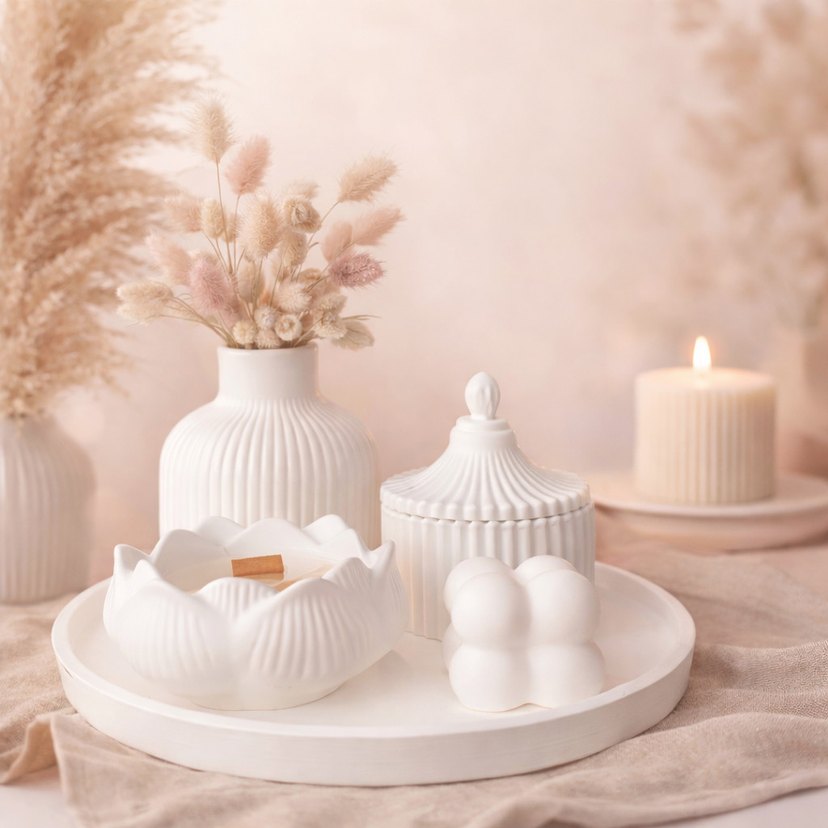 Pastel beyaz renkte, kurutulmuş çiçekli oluklu vazo, kapaklı kutu, dalgalı kase ve kabarcık şeklinde mumdan oluşan dekoratif set. ️