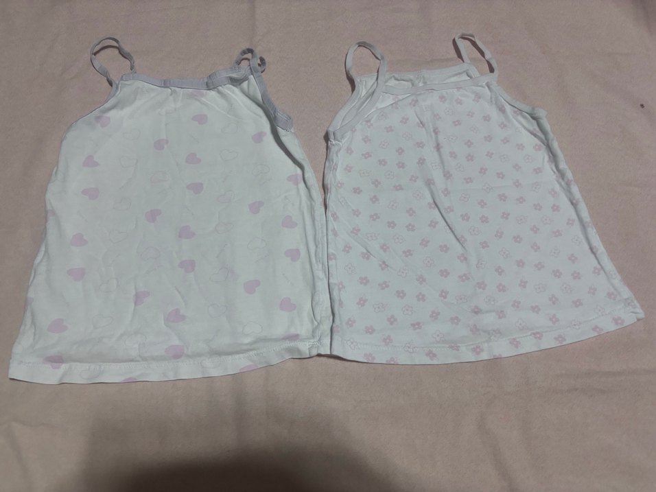 İnce askılı, beyaz ve pastel tonlarda iki kız çocuk atleti. Kalp ve çiçek desenli, yumuşak ve rahat kumaş.