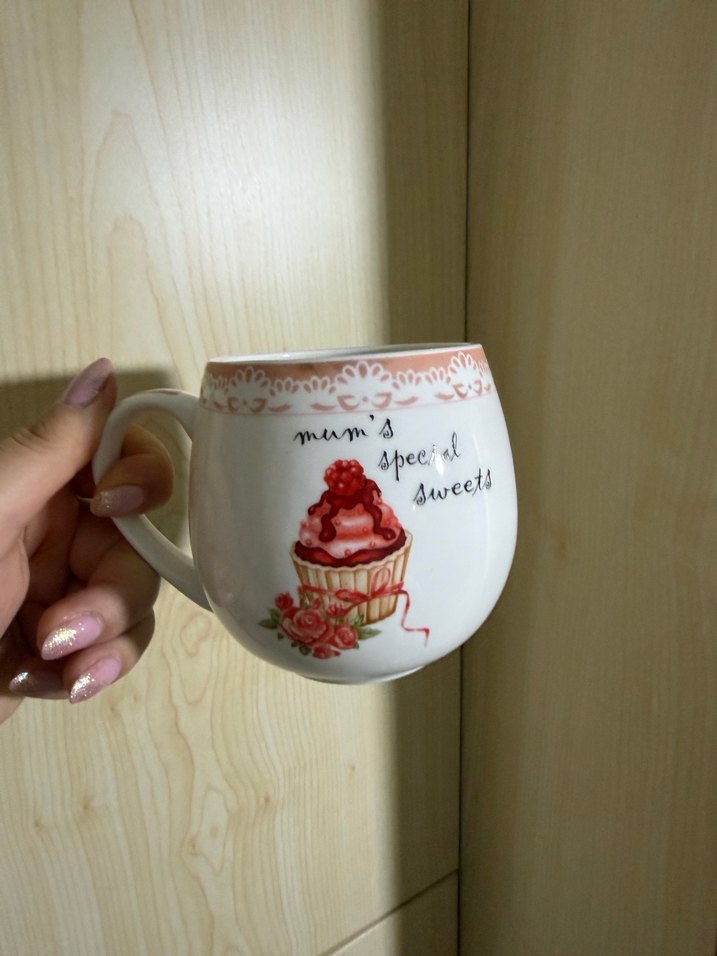 Beyaz pastel renkte, cupcakeli ve "mum's special sweets" yazılı yuvarlak kupa. Üst kısmında dekoratif pembe desen bulunur. ☕️