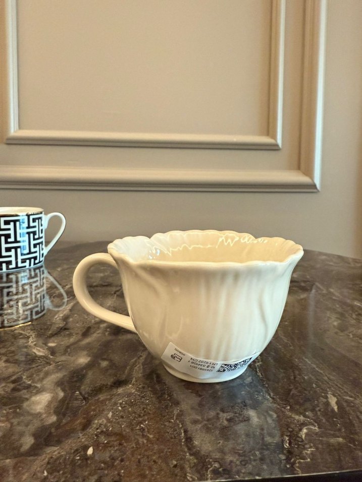Beyaz seramikten yapılmış, pastel desenli ve dalgalı kenarlı, rahat saplı bir kupa. ☕