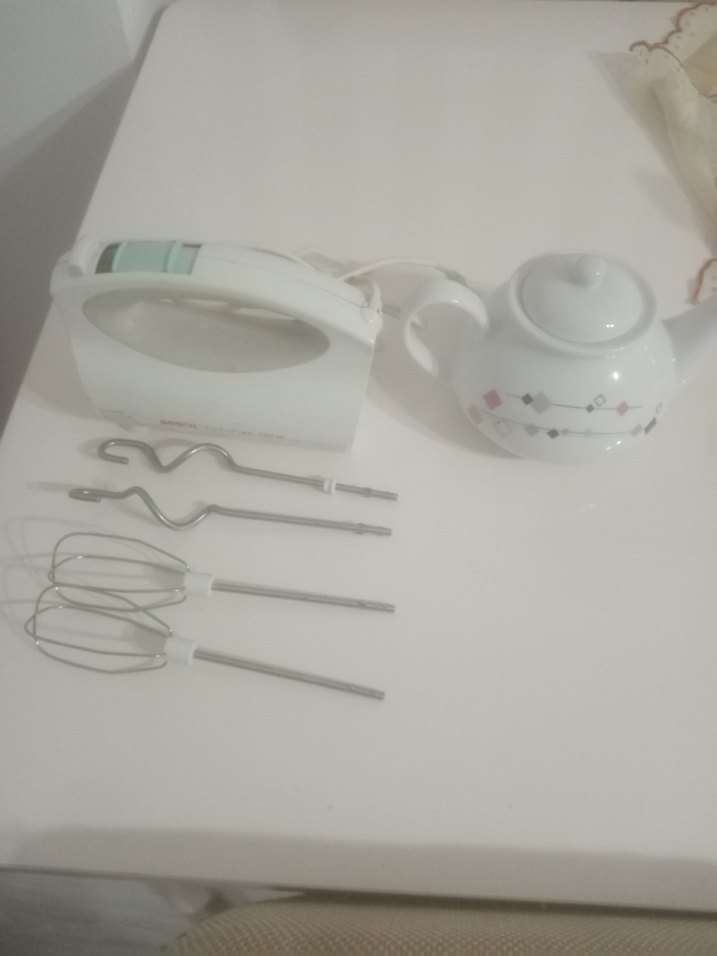 Pastel detaylı beyaz el mikseri, çırpıcılar, hamur kancaları . işleri için uygundur. Çaydanlık hiç kullanılmadı mikser çok az kullanıldı beklemeden dolayı dışında çok hafif çizik var