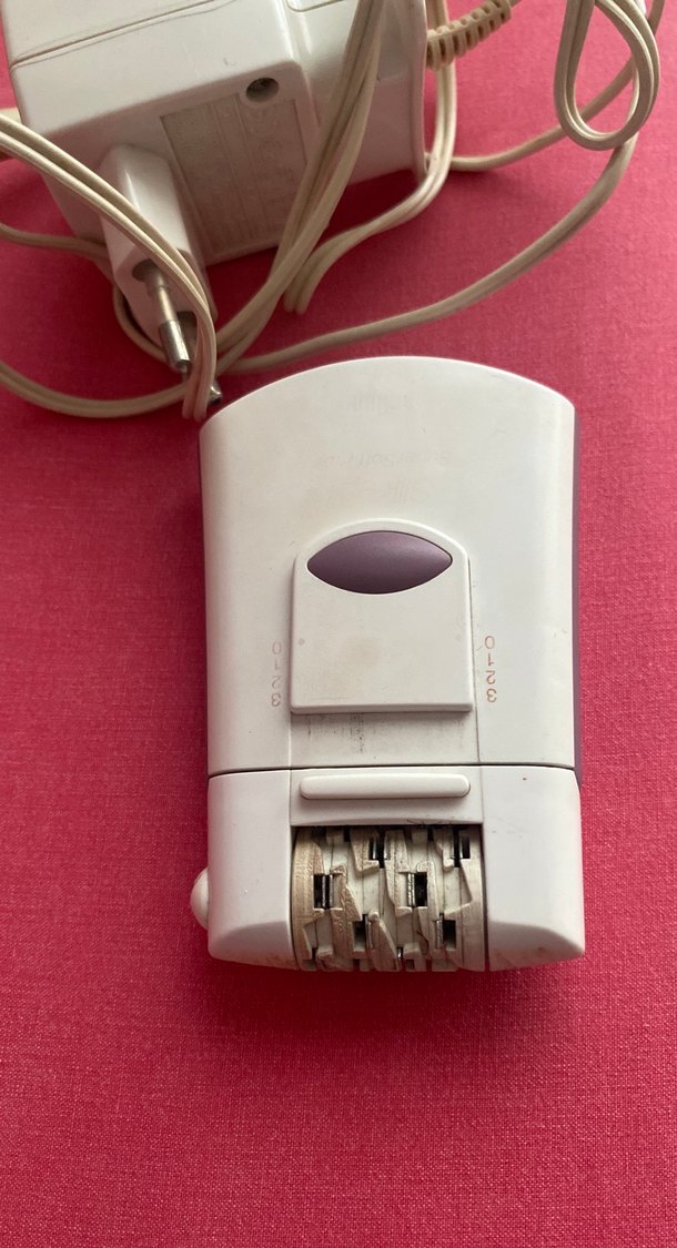 Beyaz pastel renkte, kontrol düğmeli ve çoklu döner cımbızlara sahip kompakt epilatör. Kablo ile çalışır. ✨
