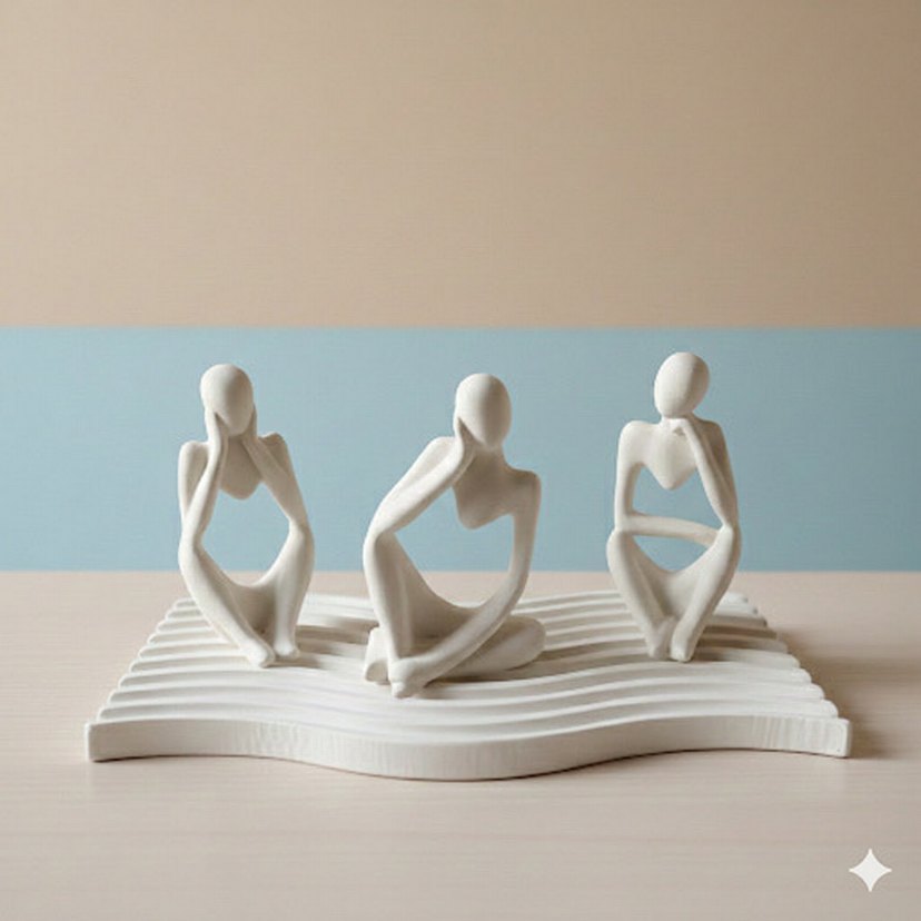 Beyaz pastel renkte, soyut insan figürlerinden oluşan üçlü set, dalgalı bir taban üzerinde farklı pozlarda yer alıyor.