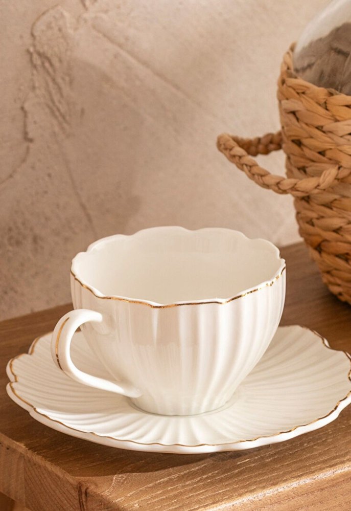 Pastel beyaz ince altın kenarlı, dalgalı kenarları olan fincan ve tabak seti. ☕ Sıfır kutulu ürün. Tek kişilik, Çay/Kahve Fincanı 220 ml