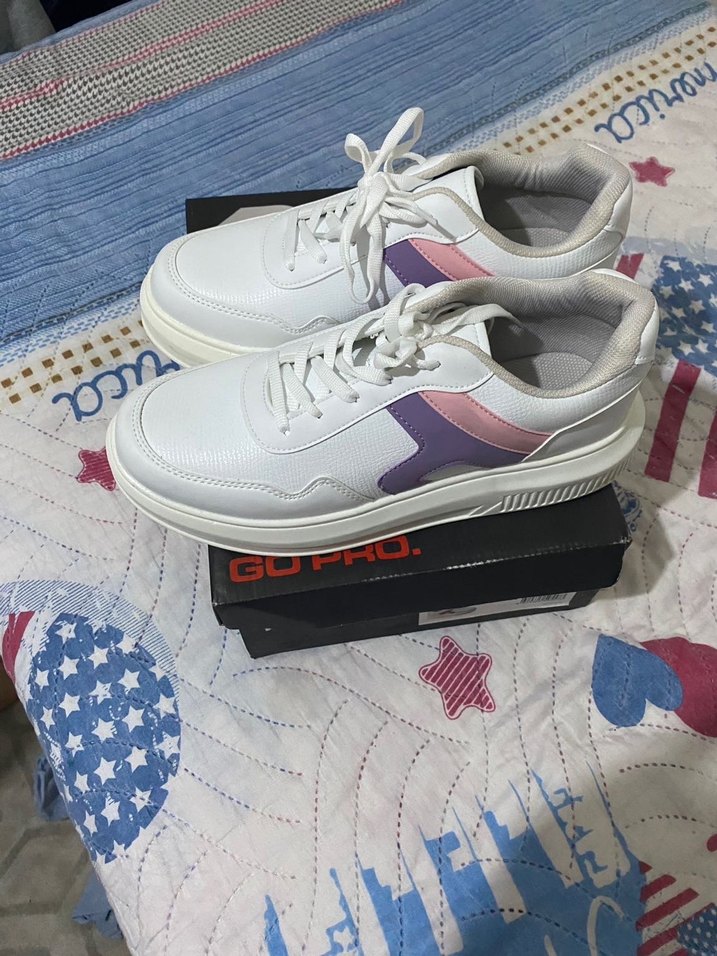 Beyaz renginde, pastel renkli bağcık ve cırt cırt detaylı, platform tabanlı kadın spor ayakkabısı. Günlük rahat sokak stili için uygundur.