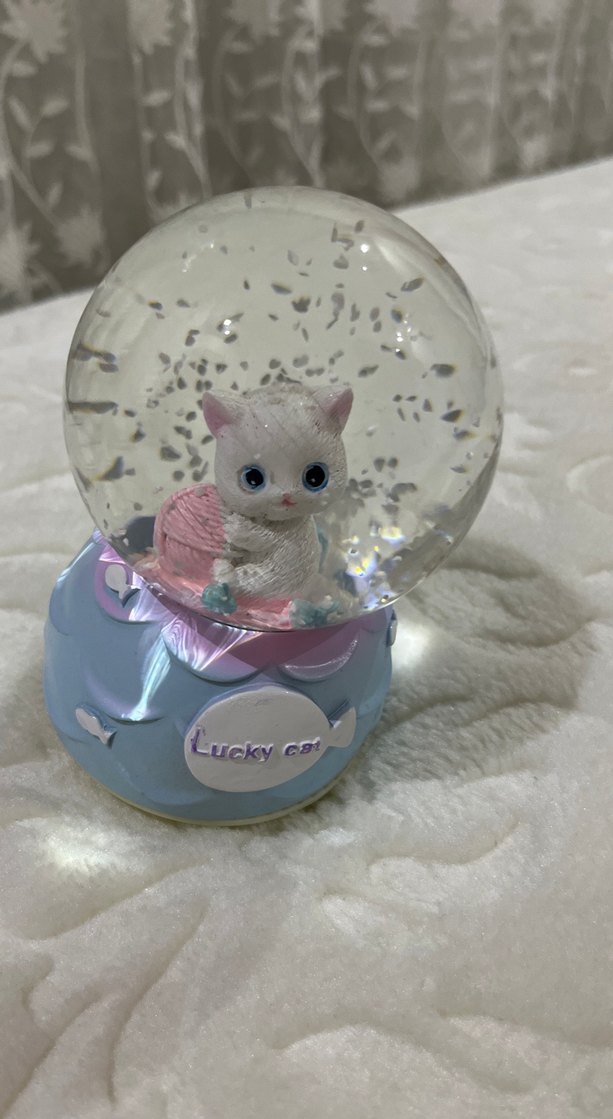 Pastel renkli, içinde beyaz kedi figürlü kar küresi. Alt kısmı mavi ve üzerinde "Lucky cat" yazısı bulunur. ❄️