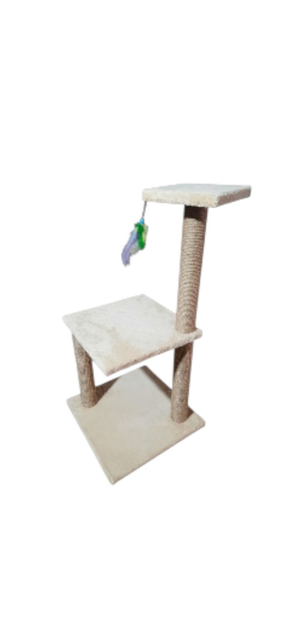 Beyaz renkte, yumuşak kumaş kaplı çok katmanlı kedi tırmalama ve oyun istasyonu. Asılı tüy oyuncak içerir.