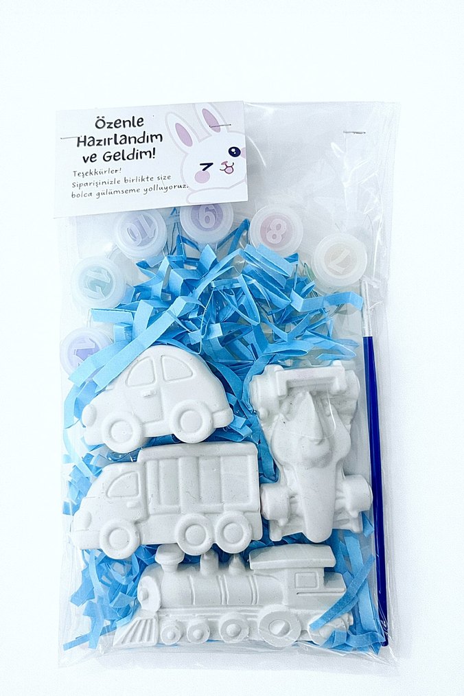 Beyaz pastel renkli araba, itfaiye aracı, uçak ve tren model seti, fırça ve mavi dolgu malzemesi ile birlikte gelir. Pakette "Özenle Hazırladım ve Geldim!" yazısı bulunur. Mıknatıs hediyeli. Toplu sipariş için yazın