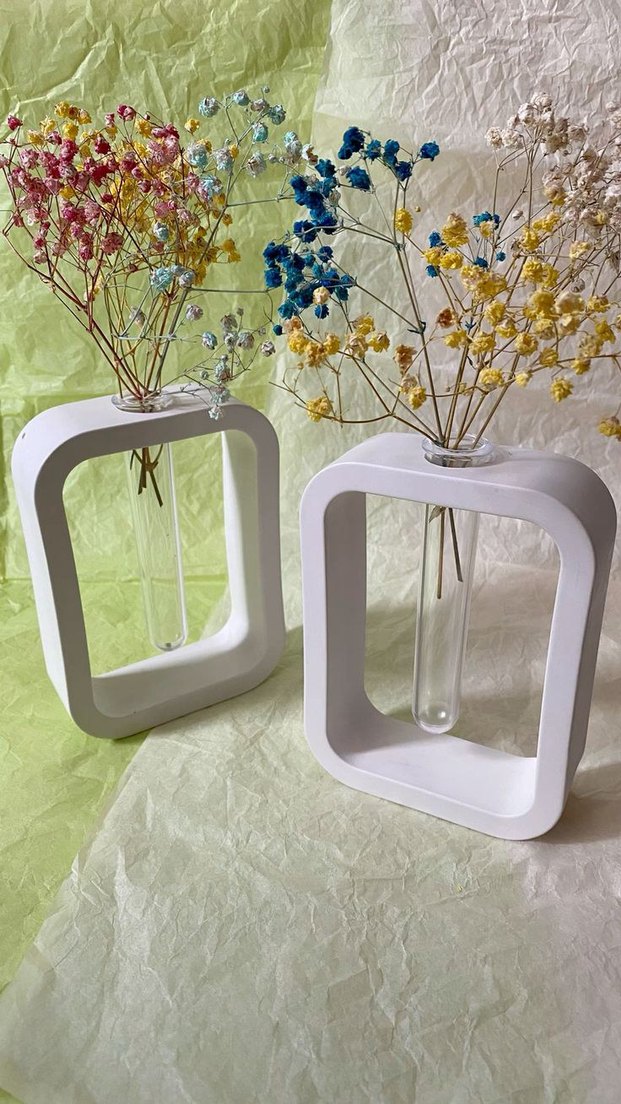 Modern dikdörtgen çerçeveli, içinde şeffaf cam tüp bulunan beyaz pastel renkte iki vazo tekli