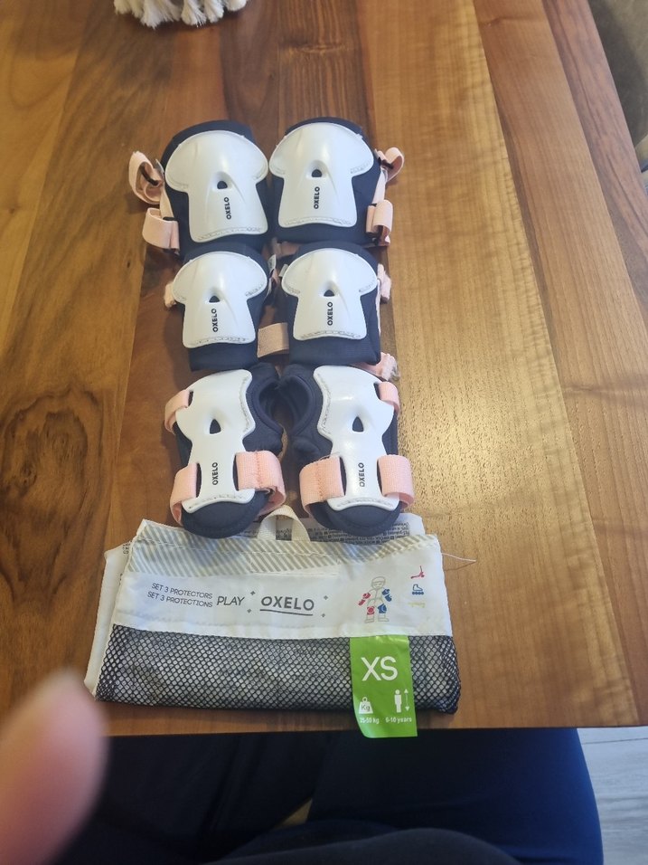 Plastik malzemeden yapılmış, beyaz pastel renkli motosiklet dizlikleri, Velcro bantlıdır. XS beden, baskılı street wear tarzında, athleisure için uygundur. ️