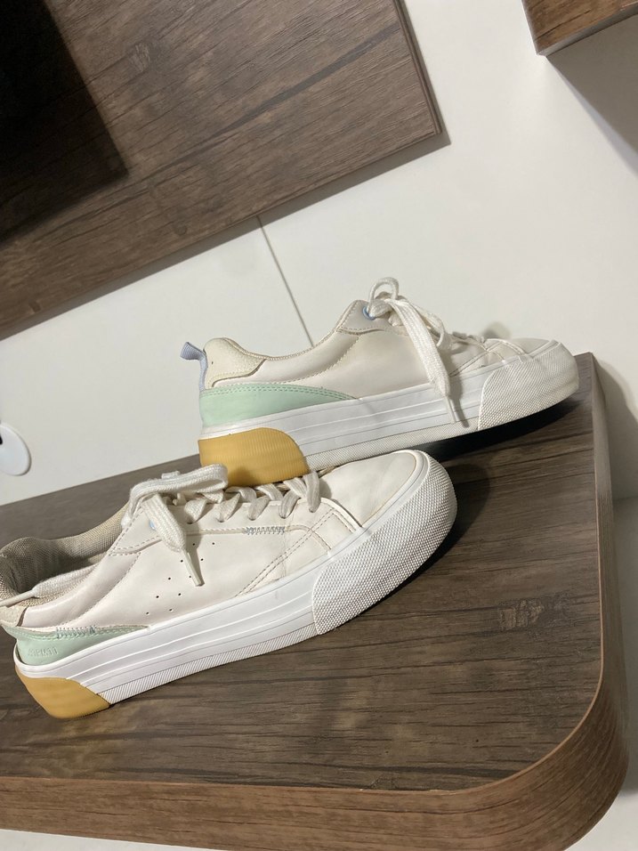 Beyaz, pastel detaylı kadın spor ayakkabısı, platform topuklu ve kauçuk tabanlı. Rahat ve şık sokak stili için uygundur.