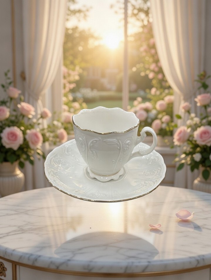 Beyaz Pastel Porselen Kahve Fincanı ve Tabağı altın yaldızlı 6lı