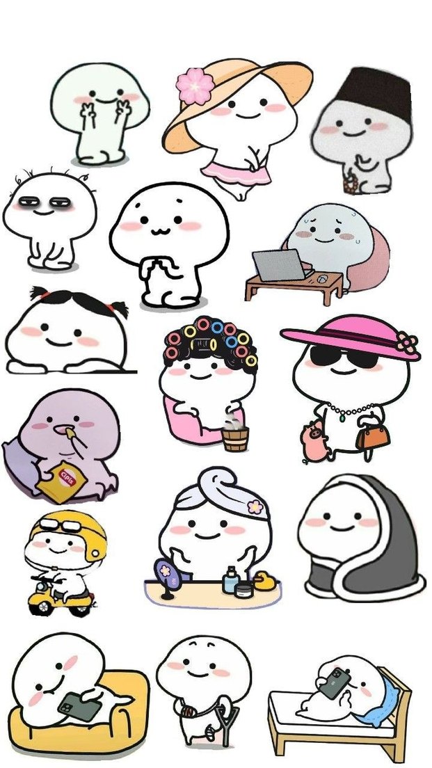 Beyaz renkte, pastel tonlarda çeşitli sevimli ifadeler ve aktiviteler içeren animasyon figürleri koleksiyonu. Sticker