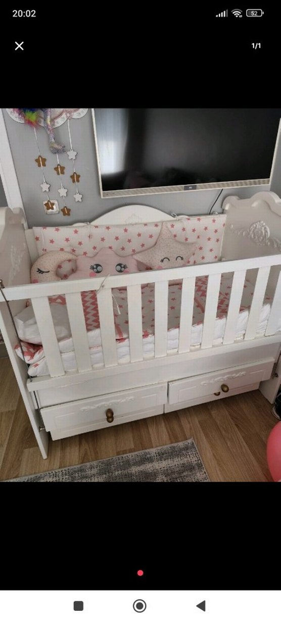 Diger markasına ait beyaz, pastel renkli bebek beşiği, alt kısmında çekmeceler bulunan sağlam tasarım. ️