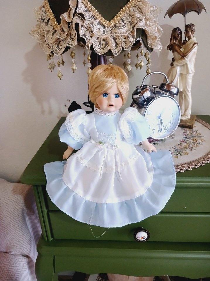 Dantel detaylı, beyaz pastel renkte elbise giymiş, sarı saçlı ve mavi gözlü klasik ve zarif bir bebek. Şişkin kollu tasarımıyla koleksiyonluk. tertemiz sorunsuz bilgi almak için yazın lütfen