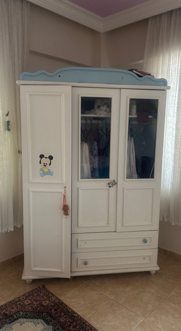 Beyaz renkte, pastel detaylı çocuk gardırop. Mickey Mouse figürü ve cam paneller ile iki çekmeceli geniş depolama alanı sunar. Sadece bazı klupları eksiktir onun dışında bi şeyi yoktur