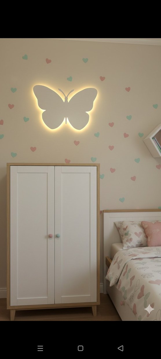 Üzerinde pastel renkli kelebek desenli aydınlatması olan beyaz çocuk gece lambası