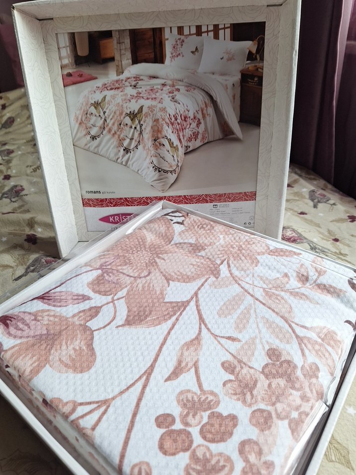 Beyaz zemin üzerine pastel renklerde çiçek desenli Çift kişilik pike ve çarşaf takımı. Yumuşak dokusuyla konfor sağlar. Kutulu ,açılmamış şekilde.