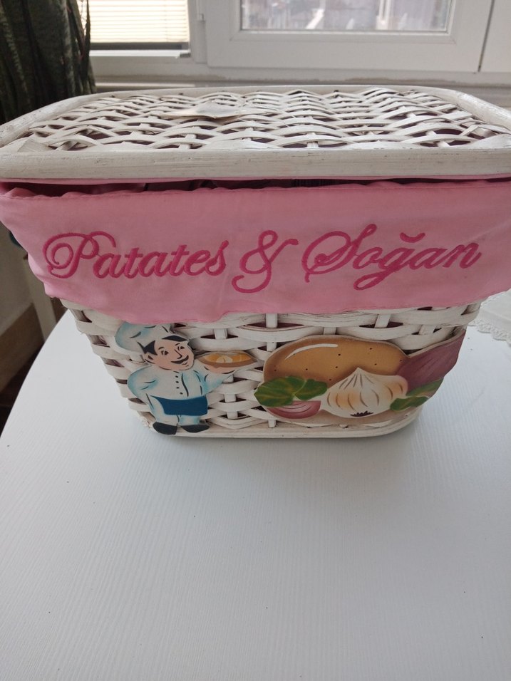 Patates ve soğan için pastel pembe astarlı beyaz sepet, mutfak temalı dekoratif görsellerle süslenmiş.
