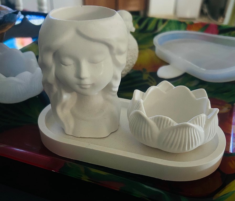 Beyaz pastel renkte kadın başı figürlü ve lotus şeklinde kase içeren dekoratif set, mekana yumuşak ve sanatsal bir dokunuş katar. Soya wax ile doldurabilir, fiyatı sorun
