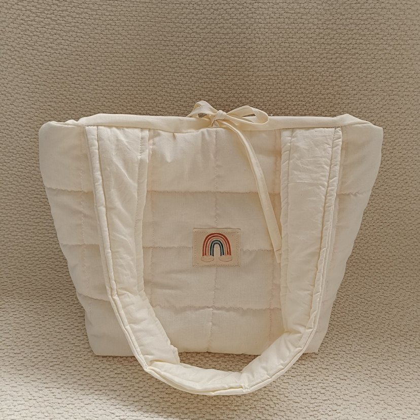 Beyaz pastel renkte, kapitone dokulu ve önünde küçük gökkuşağı desenli kol çantası. Uzun, dolgulu askılarıyla rahat taşıma sağlar.