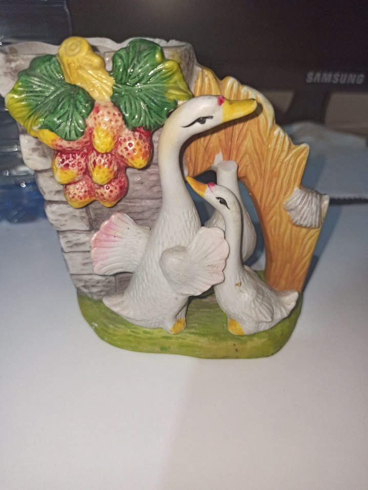 İki beyaz ördek figürünün pastel renklerle süslendiği, çiçek ve ahşap detaylı dekoratif obje. Gösterim için hoş bir parça. Sadece 3.ördeğin fotoğrafta görüldüğü gibi kafası kopuktur.