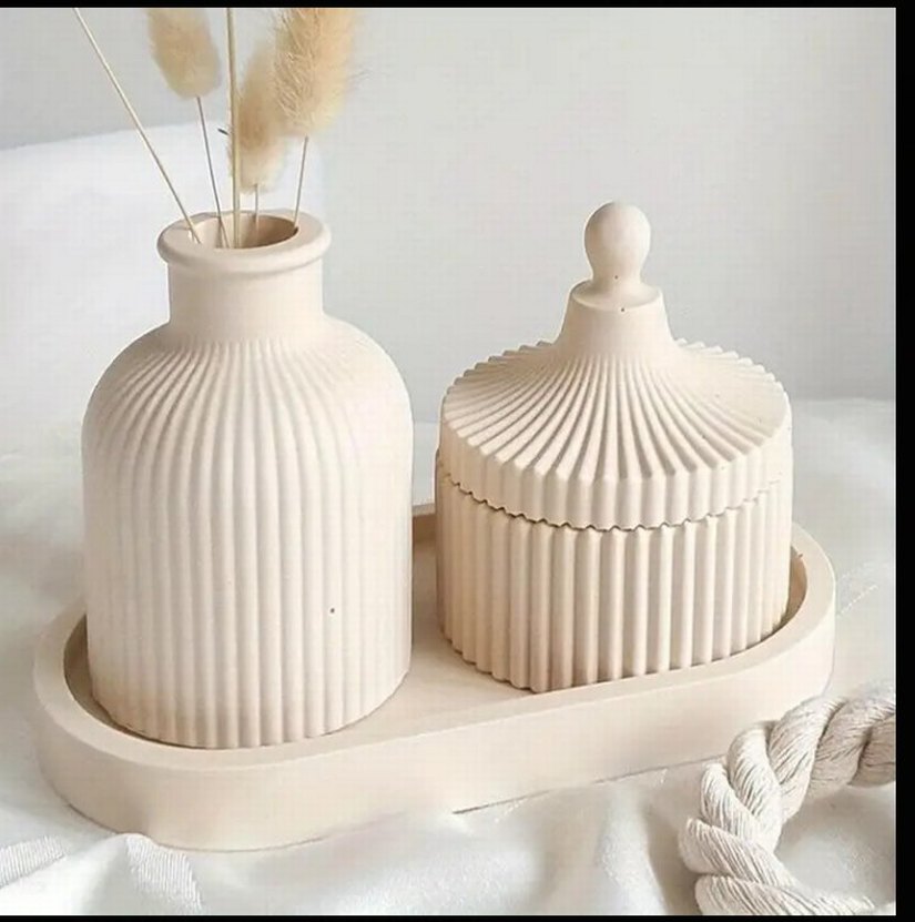 Beyaz pastel renkte, seramik malzemeden yapılmış, kabartmalı dokulu mumluk ve kapaklı kavanoz seti. Dekoratif kullanım için uygundur. ️
