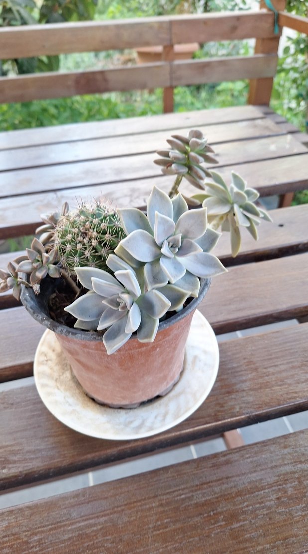 Beyaz pastel tonlarda sukulent ve kaktüs çeşitleri içeren küçük saksı, ahşap masa üzerinde ve tabakta yer alıyor. 2 çeşit sukulent,1 adet kaktüs.