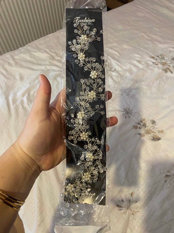 Beyaz renkte, plastikten yapılmış payetli çiçek desenli bohem tarzda kadın saç aksesuarı. ✨