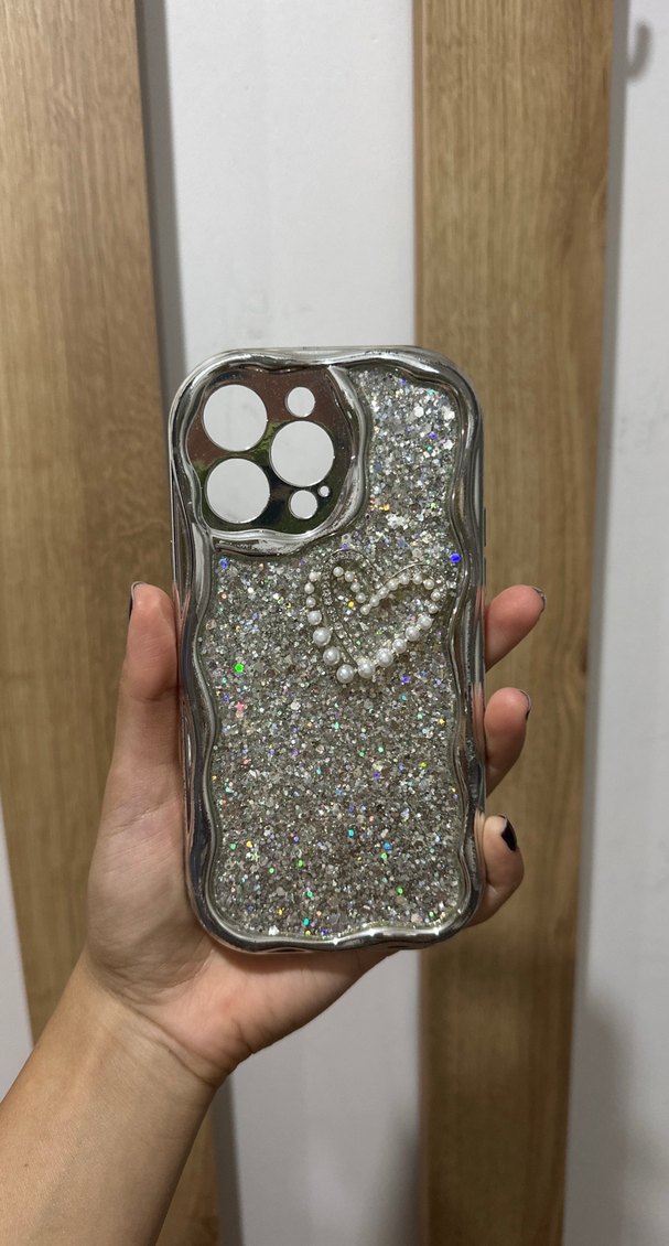 Beyaz renkte, payetlerle kaplı, boncuklu kalp detaylı bohem tarzda telefon kılıfı. ✨ 14 pro max
