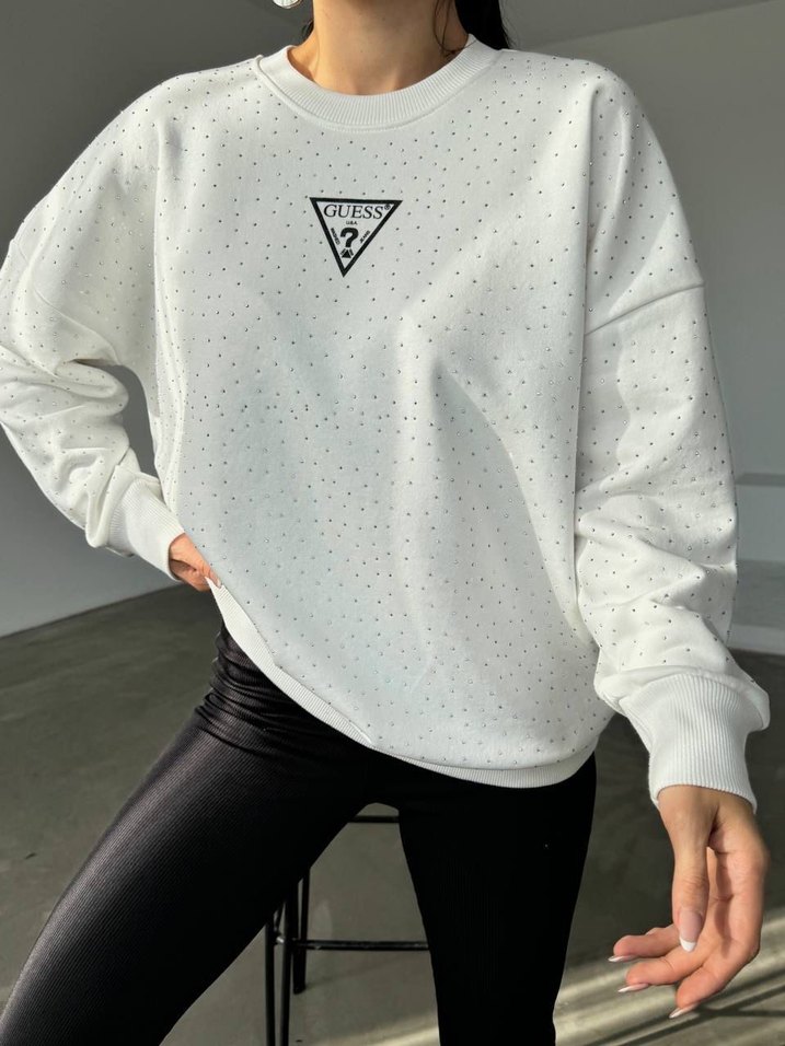 Beyaz, uzun kollu, yuvarlak yaka Guess sweatshirt. Rahat kesimi ve payet detaylarıyla günlük kullanıma uygun şık bir parça. ✨ 3 iplik şardonsuz S M L BEDEN