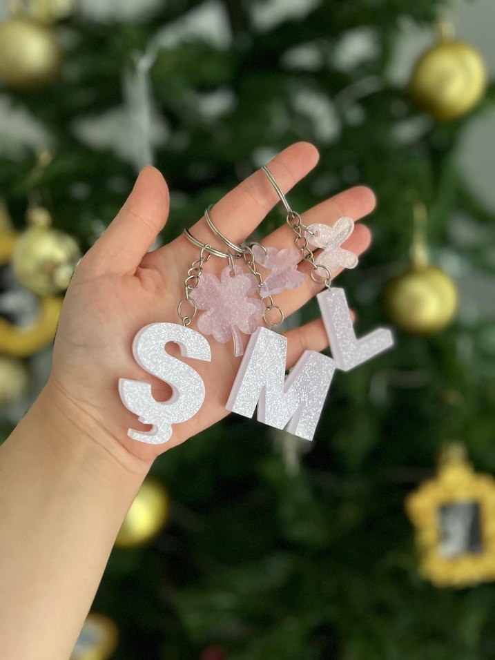 Beyaz payetli S harfi anahtarlık, minimal ve sokak stili uyumlu, küçük çiçek detayı içerir. ️