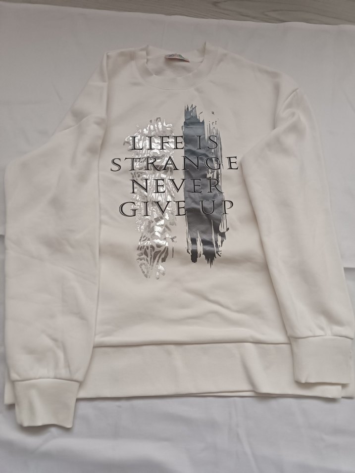 Beyaz kadın sweatshirt, uzun kollu ve yuvarlak yaka. Payetli baskılı deseni ve bol kesimiyle günlük kullanıma uygun. Kısa boyda, sentetik kumaştan üretilmiştir. ✨