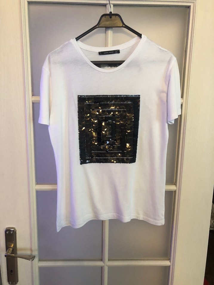 Beyaz renkli, kısa kollu ve yuvarlak yaka kadın tişörtü. Önünde parlak payetli baskı bulunur, bol kesim ve tekstil kumaştan üretilmiştir.