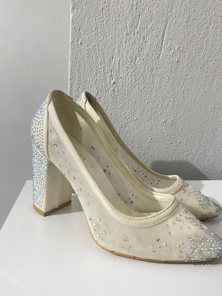 Beyaz, payet detaylı kadın abiye ayakkabı. Blok topuklu, sentetik kumaştan ve hafif yılan derisi desenli, düğünler için uygun şık model.✨