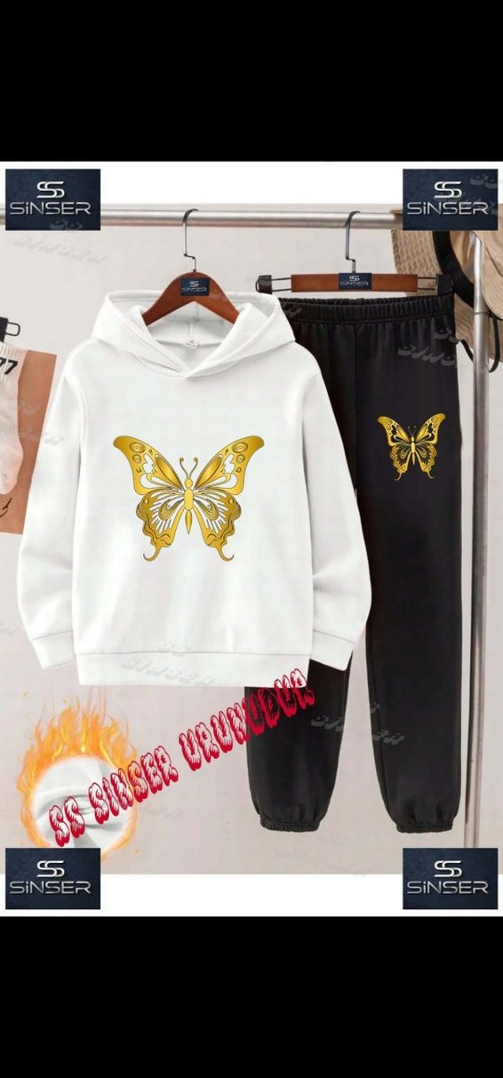 Erkek çocuklar için beyaz kapüşonlu sweatshirt ve siyah pantolondan oluşan, payetli sarı kelebek baskılı, bol kesim eşofman takımı. Sweatshirt bisiklet yaka, sentetik kumaş.