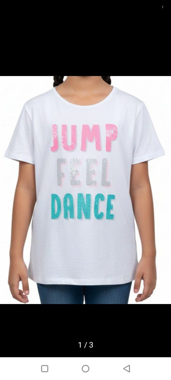 Pamuklu, kısa kollu, yuvarlak yaka ve bol kesim beyaz tişört. Üzerinde "JUMP, FEEL, DANCE" yazılı renkli payetli baskı bulunur.